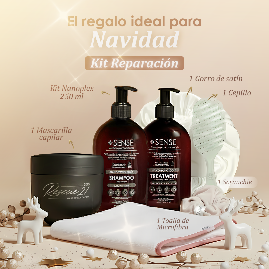 El Kit Reparación SENSE incluye: Shampoo + Acondicionador de Nanotecnología 250 ml, Mascarilla SOS 21 Rescue 300 g, Gorro de Satín, Toalla de Microfibra, Scrunchie y Cepillo Desenredante.